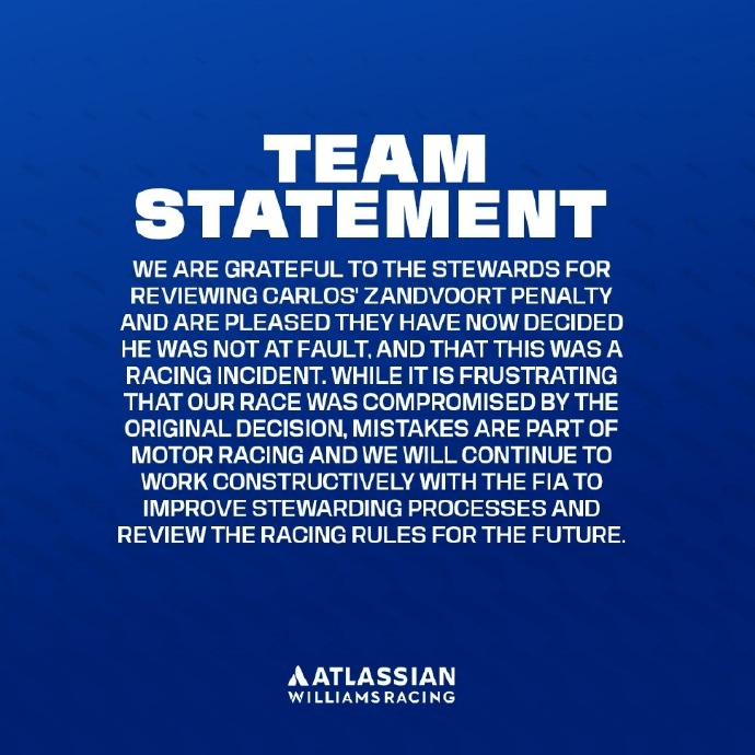 虎扑09月13日讯在国际汽联将塞恩斯与劳森在荷兰大奖赛的碰撞事故重新裁定为赛道事故后,威廉姆斯车队发布官方声明,对于这一结果感到认可。