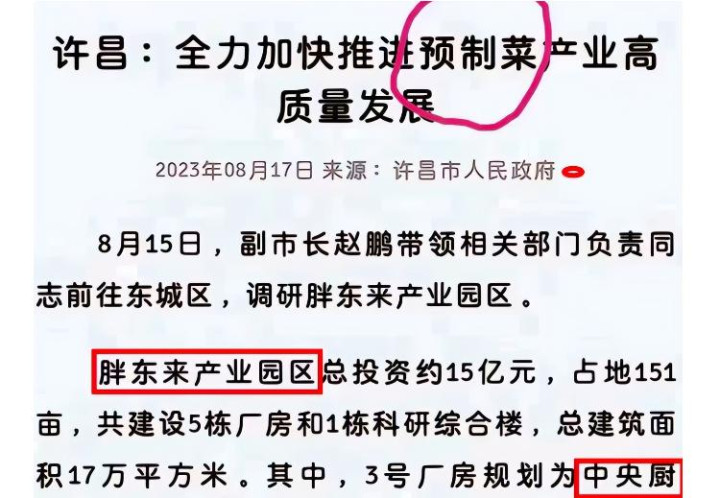早在2023年,胖东来企业就在总投资 15 亿元的产业园中,明确规划了“中央厨房”的使用。