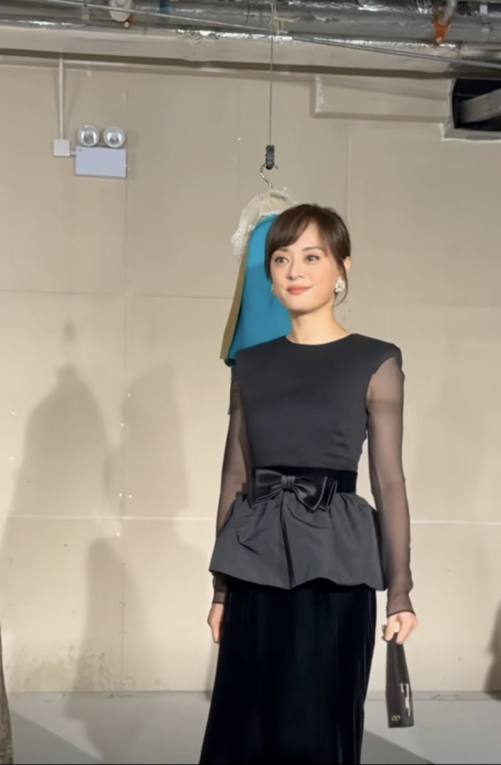 小礼服包裹着纤瘦的身材,宝石耳钉衬得她美丽高贵,发型利落,眼睛也不凸了,颜值回春,中年女人的韵味也出来了。