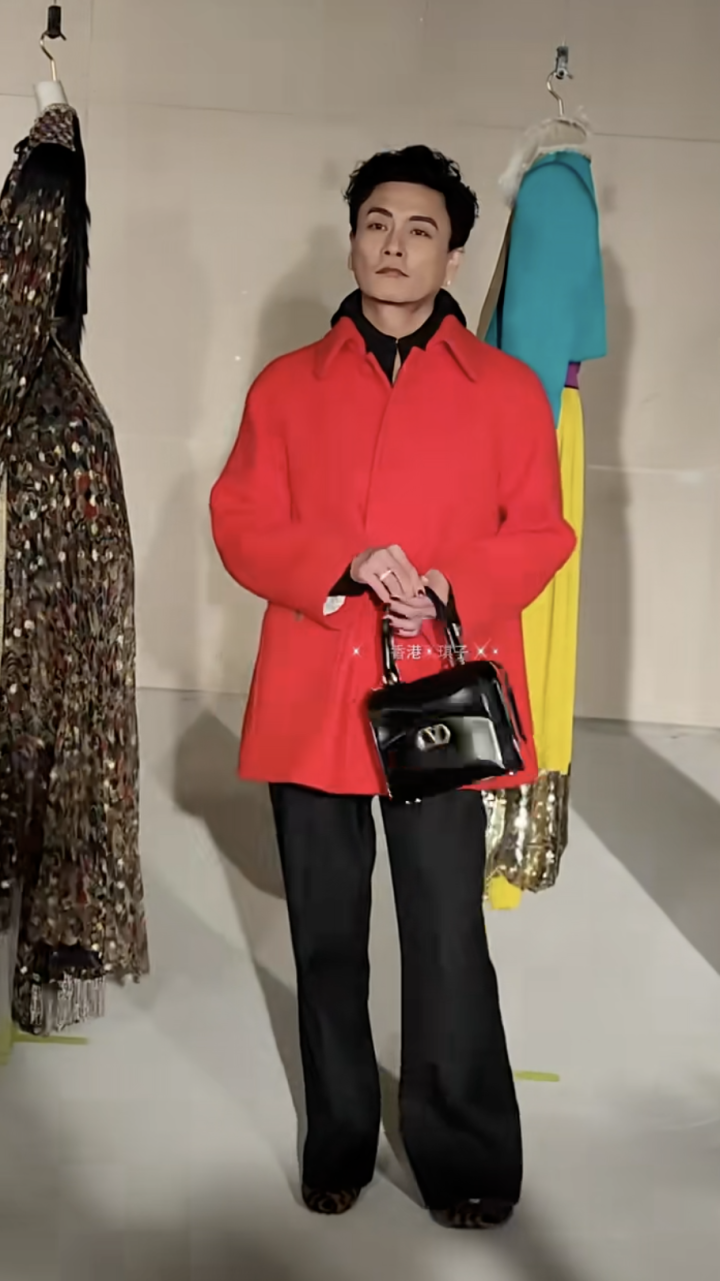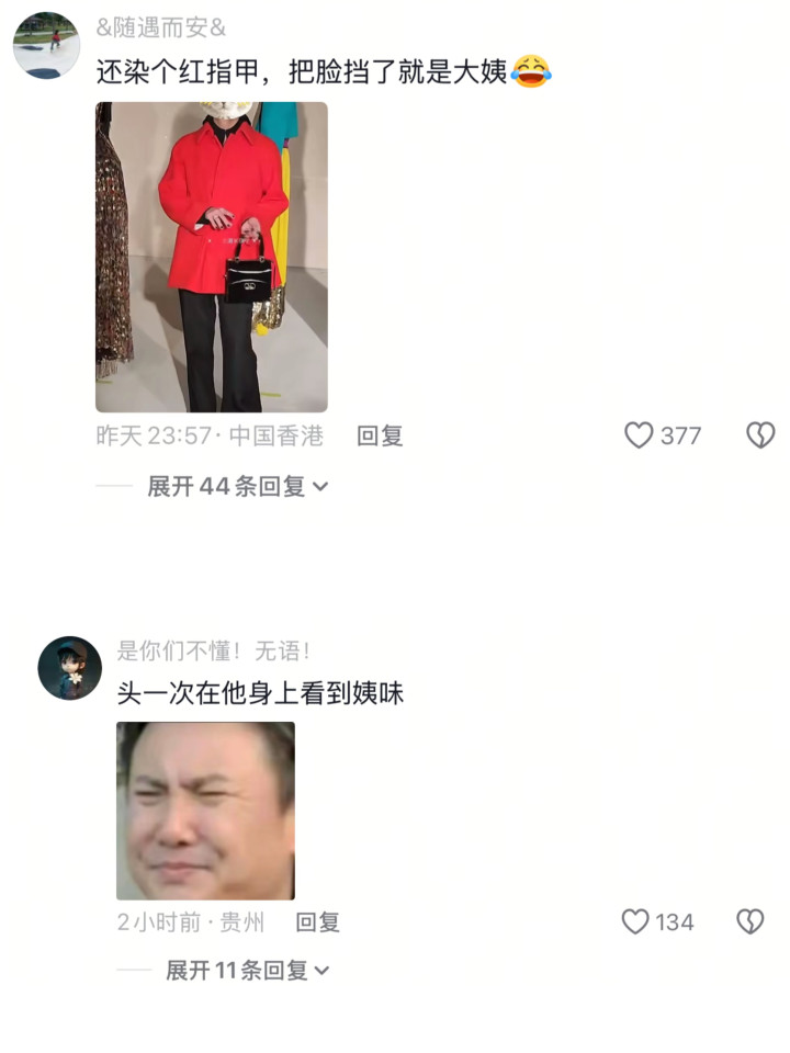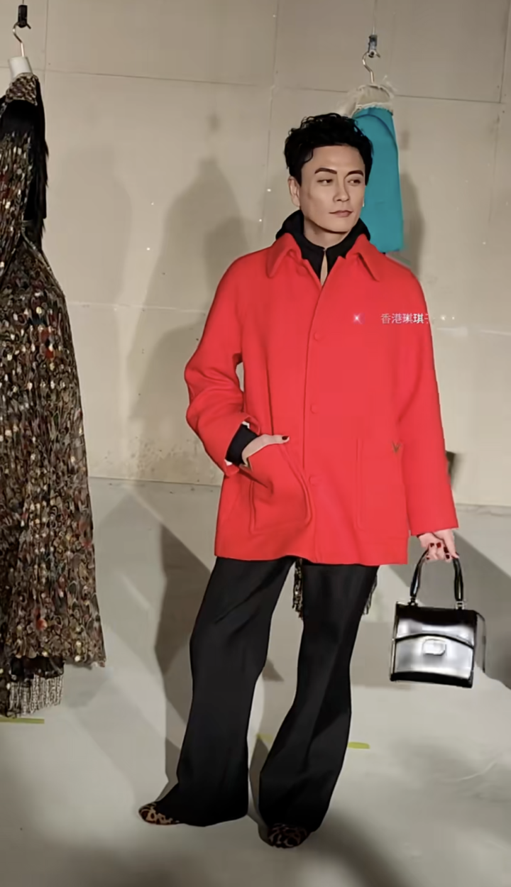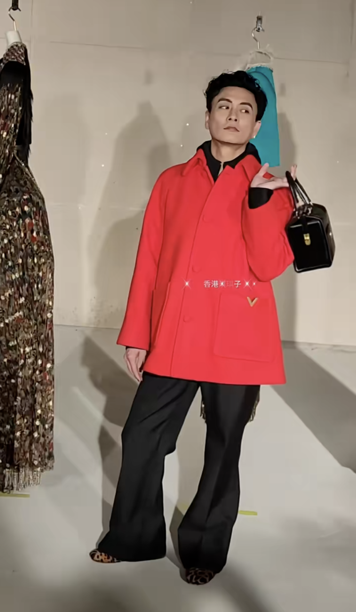 可是入场后,他穿上了品牌方的红色毛呢大衣,波浪卷发、红色大衣、黑色的阔腿裤,再配一双豹纹小皮鞋,拎一只黑色的包包,涂上黑黑的指甲油,瞬间就有点大姨的感觉了,还是东北那种很富有的大姨既视感。