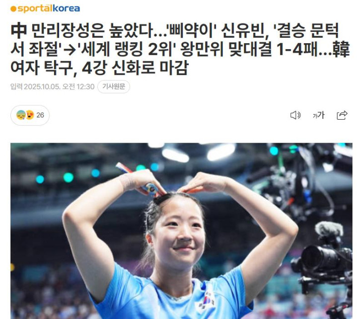 韩国媒体《SportalKorea》赛后发文:中国成长很高,申裕斌在半决赛受挫无缘决赛,面对世界排名第二的王曼昱1-4败北,北京大满贯女单以4强神话结束。