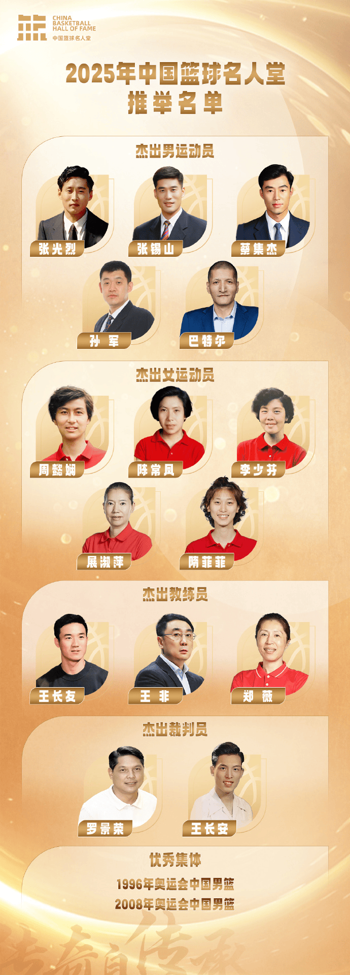 虎扑10月16日讯中国篮协官方发布2025年中国篮球名人堂推举名单,巴特尔、孙军及08奥运男篮在列。