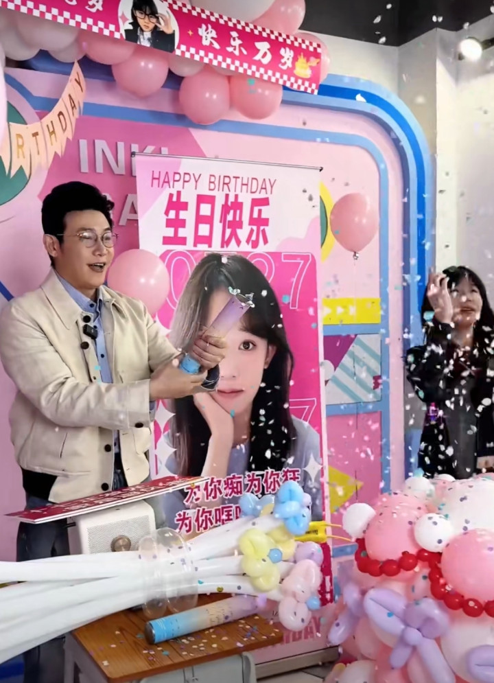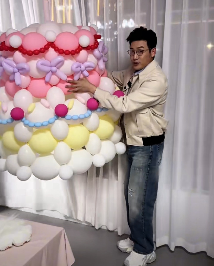 鲍蕾带着贝儿拍照的时候,陆毅和小叶子也没闲着,父女俩准备了一个现在网上很火的气球蛋糕和一束粉粉嫩嫩的鲜花,以及各种应援牌和易拉宝,布置了一个生日派对的场景。