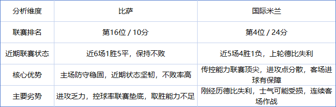 这场意甲对决是典型的“强弱对话”,国际米兰在整体实力和交锋历史上占据明显优势,但坐镇主场的比萨也并非没有抢分的机会。