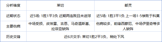 综合来看,这是一场双方都存在明显困难的比赛。莱切拥有主场之利但进攻乏力,都灵客场表现平平且伤病较多。