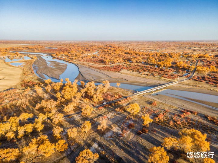 塔克拉玛干沙漠边缘的“世外桃源”,茫茫无边的原始胡杨林,与沙漠、河流、湖泊等景观相互映衬。金色林带如飘带缠绕着赭红色沙丘,日落时分会把天空染成美丽的琥珀色。