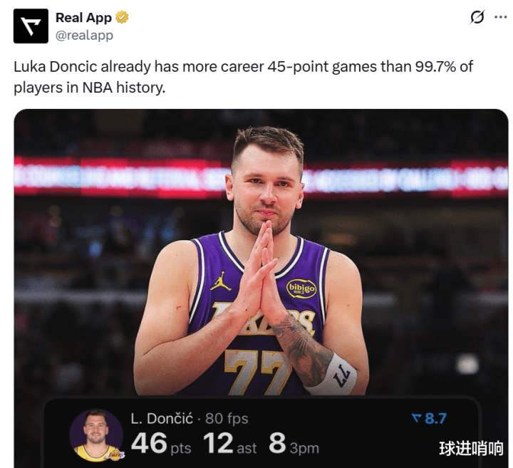 纪录四:本场是东契奇生涯第20次单场交出45+得分表现,成功追平利拉德、威少和贾巴尔并列历史第15名,已经超过NBA历史上99.7%的球员;