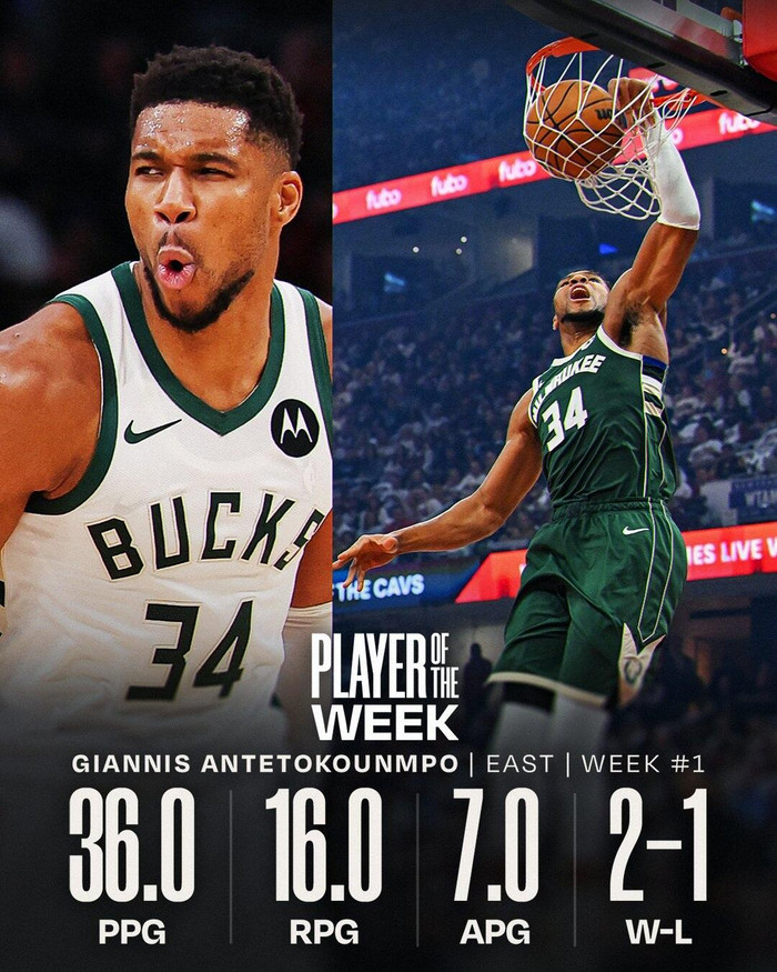 安特托昆博上周2胜1负,场均36.0分16.0篮板7.0助攻。