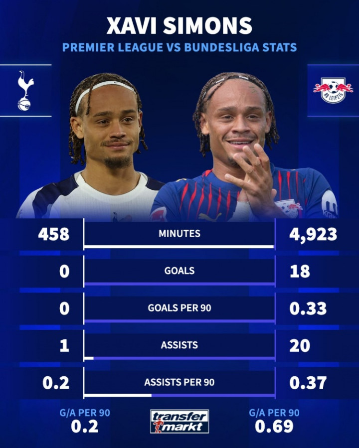 直播吧11月4日讯德国转会市场统计了热刺新援哈维-西蒙斯在德甲和英超的数据,并做出对比。